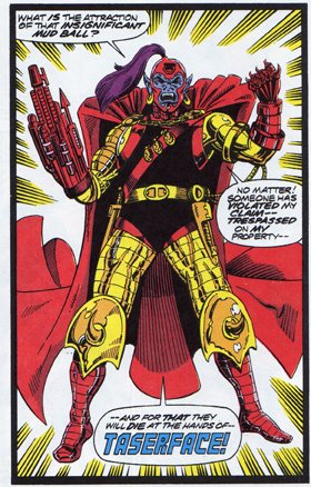 If you’re like me, you’ve been enjoying the hell out of Guardians of the Galaxy which spun out of Annihilation Conquest’s Star-Lord miniseries. That got me curious about the previous incarnation of the Guardians of the Galaxy, so when it popped up on someone’s Sequential Swap list, I swapped for it. And man, there’s no more 90s story than this one, which collects the first 6 issues of the series. The idea is that this is set in an alternate future where War of the Worlds happened on the 616 and wipes out all the heroes. This is way in the future and the Guardians end up fighting a group called The Stark who, through means I care not to spoil, evolved with full-on Tony Stark technology. I liked the “what happened to THIS character” feel of the story and would definitely read an Essential volume or two to see where the full story went, but, like I said, it’s very 90s. In addition to briefly explaining every team member’s origin, powers and home planet with almost the exact same wording every issue and coming in that same weird size as the Armor Wars trade I read, there’s also Taserface:
