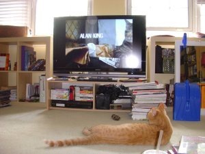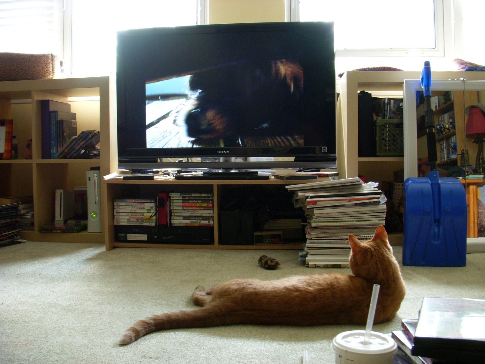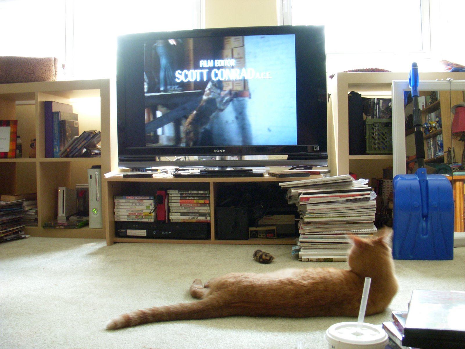 So did my cat Milo. Before getting into the movie review, here’s a few pics I took of him watching the cat (the connector of the three stories) run away from a dog. He loves watching animals on TV.
