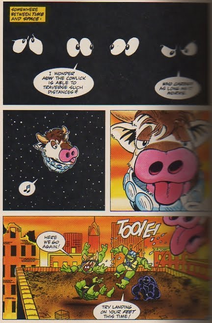 You guys, this was a weird one. I think this is a pre-Archie mini series (three issues, if I’m reading everything right) and boy is it crazy. Not only do you get a non-canon origin of the Turtles and Splinter as told by Splinter to April in the very beginning, but you also get highly complicated origins for Man Ray, Leatherhead and a surprise appearance from one of my favorite secondary characters (at least in toy form) Ace Duck. Voodoo curses, alternate dimensions, Krang in his robot suit, the Turtles in luchador-like costumes and a floating cow head who can traverse time and space. That’s what you get in this volume. I’m not really sure how to explain it any other way than weird. If anyone knows how all this stuff fits in with the rest of the animated TMNT comics, please let me know. Here’s a page scan to give you a taste of the weirdness: