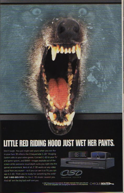 This was scanned from Major Bummer #5 which has a cover date October 1997. I remember seeing this image, but never really read the copy (I rarely stop on ads, unless they’re house ads for comics). Aside from the hilarious “bad ass” text, I’ve gotta say this ad intrigues me. Did C-3D ever come out? I know they’re working on some cool 3D TVs right now, but did anyone ever pick one of these bad boys up? I need to know!