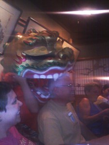 Someone told the folks at the restaurant it was Em’s dad’s birthday so this dragon covered in bells tried to eat his head. Luckily, I jumped up in time to fight him off. No big deal.