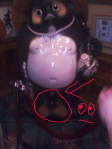 This weird monkey thing was out in the lobby on the way out. As you can see by my Perez Hilton-eque Photoshop work, it had a huge twig and berries.