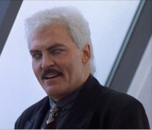 Anyway, we open with a white haired Stacey Keach who, for reasons never explained, sports a mullet that terminates in a rat tail between his shoulders and white-except-for-his-pupils eyes. He’s part of a program for the DED (the Department of Educational Defense) who has these teacher robots he wants to insert into Malcolm McDowell’s school. Also, for no real reason, Cody gets released from jail at the same time. Here’s some pics (thanks to this post, I figured out how to take screencaps!)