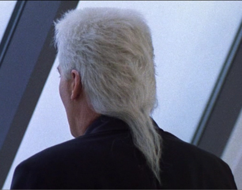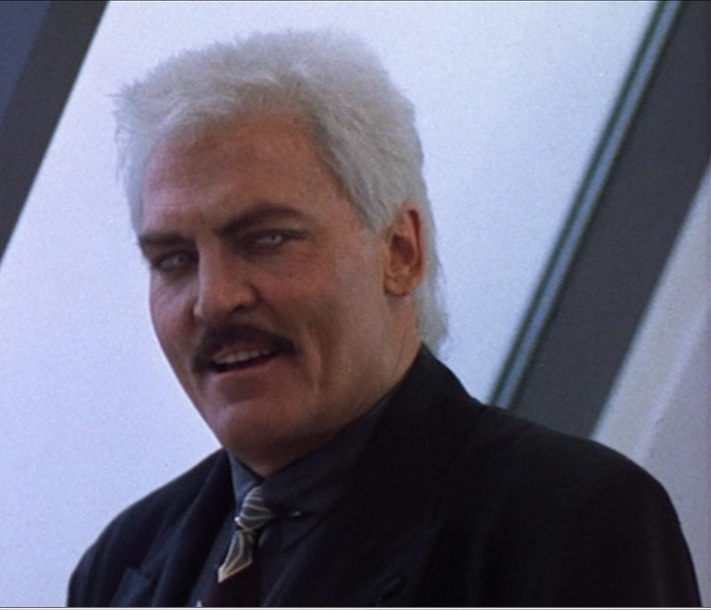 Anyway, we open with a white haired Stacey Keach who, for reasons never explained, sports a mullet that terminates in a rat tail between his shoulders and white-except-for-his-pupils eyes. He’s part of a program for the DED (the Department of Educational Defense) who has these teacher robots he wants to insert into Malcolm McDowell’s school. Also, for no real reason, Cody gets released from jail at the same time. Here’s some pics (thanks to this post, I figured out how to take screencaps!)
