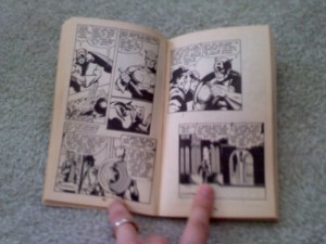 This little number was quite the oddity. I thought it was going to be one of those novels-based-on-comics things. I read a ton of the ones that came out in the 90s back then. I guess I should have noticed the “Illustrated” portion of the title. So, what you’ve got here is a strange book that collects (according to this site) collects Captain America 250, 253 and 254 which covers those issues where Captain America fights Baron Blood and meets the new Union Jack (as well as the newer Baron Blood) along with the issue where Cap says “no” to running for president. The interesting thing, which you can see in the below pic, is that they cut these comics into panels (black and white ones) and pieced them together on pages the size of the average Pocket Book. Weird right? The stories were good, though kind of slow and I would much rather read them in color. Roger Stern is the man, by the way, he’s definitely one of the most unsung writers in the history of comics.
