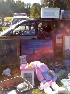 It was a good show for paintings actually as you can see in these next two pics. Right after passing the table with the above weird celebrity paintings we got near this van with several larger painting leaning up against it. You can see a painting on the far left which I think is called Little Boy Blue or some such. As a side note, this is what a lot of the various lots look like, with a van, car, table or blanket holding all of the junk people want to get rid of. But what really caught my attention was that painting to the right, can you see it?