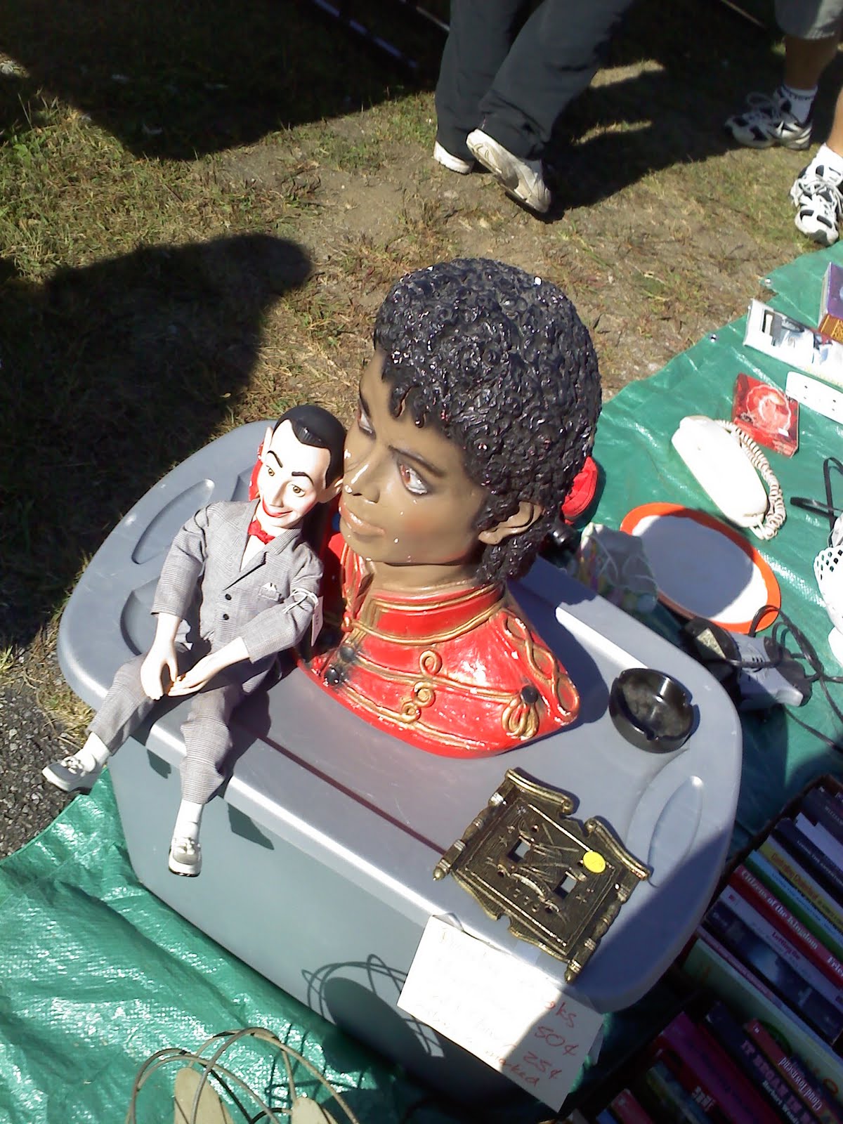 Well, here’s my favorite thing from the whole day (and that includes the demolition derby). As you can see it’s a Michael Jackson bust with a bunch of chips taken out of it and a Pee Wee Herman doll next to it. I think they were charging $30 or 40 for MJ. That’s another thing I would have purchased, you know, if it was just $5, but whatever. I’m sure someone made off with it and I envy them. It kind of looks like MJ is whispering sweet nothings or kill lists into Pee Wee’s ears, doesn’t it?