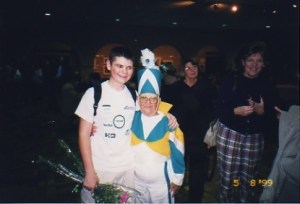 I saw this post on io9 about the five remaining munchkins from Wizard of Oz getting together for a quick interview and it got me thinking back to my days as a chorus member in my high school musicals. The reason I even tried out my sophomore year of high school was because they were doing Wizard Of Oz and I wanted to be a flying monkey (this monkey thing goes back quite a ways). Anyway, we had a new director named Michael Kastner and he wanted to make a splash by getting a surviving munchkin to come and hang out, take pictures and sign autographs. Well, when I saw the io9 post I checked the video and unfortunately Clarence Swensen is no longer with us, but don’t feel too bad for him, he lived until this year to the ripe old age of 91. Impressive. Anyway, here’s my picture with Clarence. By my count, I was 16 when this picture was taken and it’s fairly embarrassing, but what the hell? I swear, I didn’t wear makeup on a regular basis, it was after one of the performances. I wish I didn’t look like a weirdo serial killer in it, sorry Clarence.