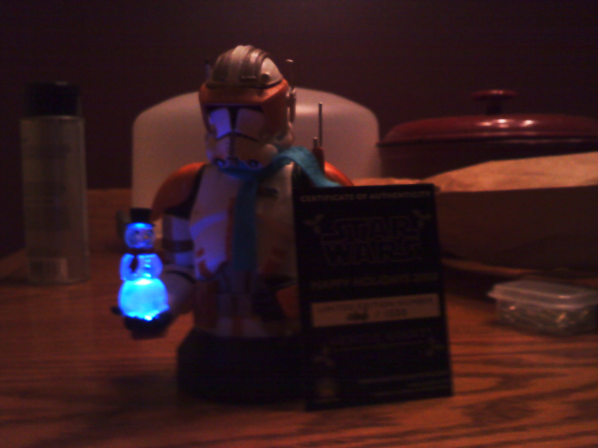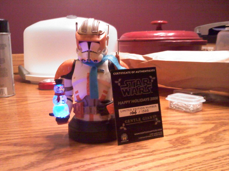 There were all kinds of perks about working full time at ToyFare. Of course, knowing what would be coming out before just about everyone else is high up there. Also, all the people were really cool and ridiculously easy to work with. And of course, getting cool stuff like this Christmas-themed Commander Cody bust with scarf an light-up snow man in his palm from Gentle Giant ranks pretty high up there. Thanks to me misplacing this bad boy last year, this is the first Christmas in which Cody will be joining the rest of our decorations. Heck, I didn’t even know he lit-up!