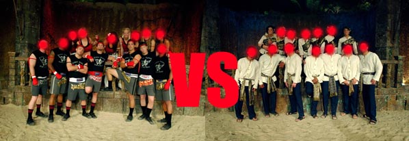 So, finally we get to the final challenge. For the record, I went in hoping the Challs pull this out over the Champs, which seems like a big possibility considering they have fewer people to work with. Things start off with a weird food eating contest. It was all pretty gross stuff like bugs and super hot chilies and I think brains, I missed what the yellowish white thing were. Kenny said this “I feel like I’m eating the asshole of the dirties bum I’ve ever met,” which may or may not be more telling than he intended. Each person on the team had to eat one of each thing. This is a pretty great equalizer challenge, which gave the Challs a leg up. From there, they go to a central point with four different paths leading to four different paths with four artifacts at the end of each challenge. Once you get all five artifacts (there was one from the eating challenge), a secret door opens and you’re off to the next part.