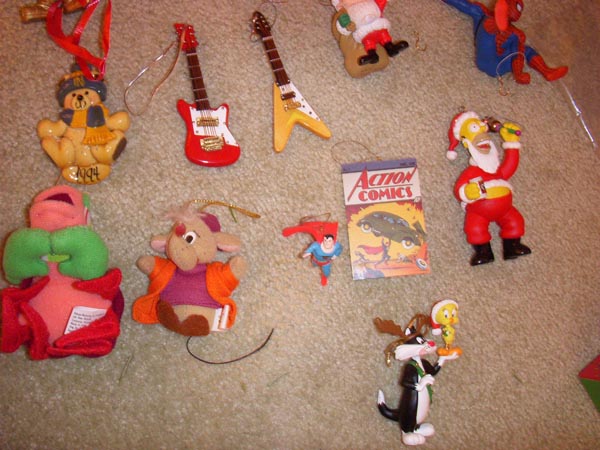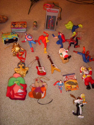 So we finally got our tree up last night. I would have posted pics of all my great nerdy ornaments, but, well, I just didn’t feel like sitting by the computer (plus, we’ve still got cleaning to do for the folks’ visit). Anyway, as you can see above, we got a pretty good sized tree and yet still had plenty of lights and ornaments to fill it up. Em has a different way of doing things than I’m used to, so she takes the lead on putting up all those glass bulbs and then I come in with my ornaments. As I’ve mentioned before, my grandma has given me an ornament every year for all of my 26 years, plus I’ve acquired a good deal from other folks. Plus, when we went to Bronners, we got all kinds of other ornaments. Many of the ones I’ve been given over the past 16 years have been comic themed or had some other kind of geek intent. Here’s all the geeky ones together.