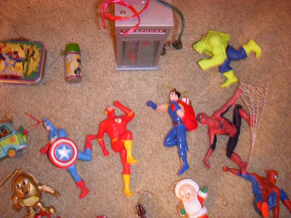 The one that looks like a phone booth actually has a rotating Superman changing into Clark Kent (or is it the other way around?) that you plug into a light socket for power. You can also see one of the most difficult ornaments to hang in the form of the Spider-Man in the bottom right hand corner there. Anyone who owns it knows what I’m talking about. Also note the totally goofy Ultimate Wolverine. Here’s a few close-ups of two of my favorite comic ornaments.