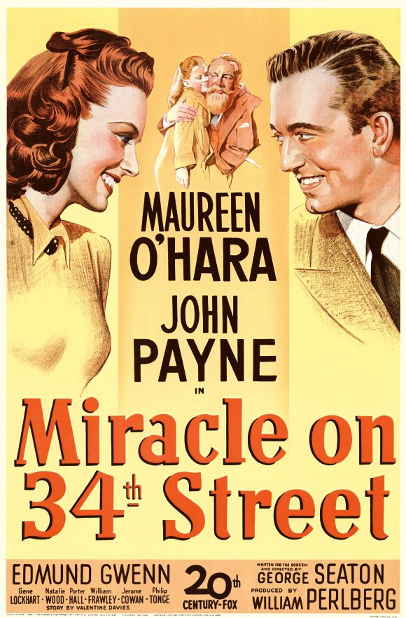 Did you know that Warner Bros. actually had so little faith in Miracle On 34th Street that they released it in the spring and tried to avoid advertising the fact that the movie takes places at Christmas (hence this poster instead of one of the more Santa-themed ones you might be familiar with). That’s crazy, right? They apparently thought it would be too schmaltzy. And actually so did I. My folks gave me this movie on DVD back when I first moved to NY and I’ll be honest, I never watched it until this weekend, though I had seen it when I was younger. But, considering we’d already watched White Christmas, Holiday Inn and a few other favorites, we landed on Miracle because Em had never seen it. In the end we were both pleasantly surprised. See, the idea is that a man claiming to be Santa replaces a drunk “Santa” in the Macy’s Thanksgiving Day Parade and ends up working in the main store as Santa. Maureen O’Hara hires him and her daughter (Natalie Wood) comes to form a friendship with the man even though she doesn’t believe he’s Santa (or in anything non-logical, she’s like mini Vulcan thanks to her mom’s programming). Of course, as you might expect, the man claiming to be Santa has his sanity called into question and visits with a crappy jerk who’s not even really a psychiatrist, who, eventually drives Santa crazy enough that he knocks the jerk in the head with his cane. Somehow, this gets him institutionalized, so O’Hara’s neighbor/love interest (played by John Payne) represents him as a lawyer and eventually SPOILER WARNING proves that he’s Santa thanks to some delivered mail.