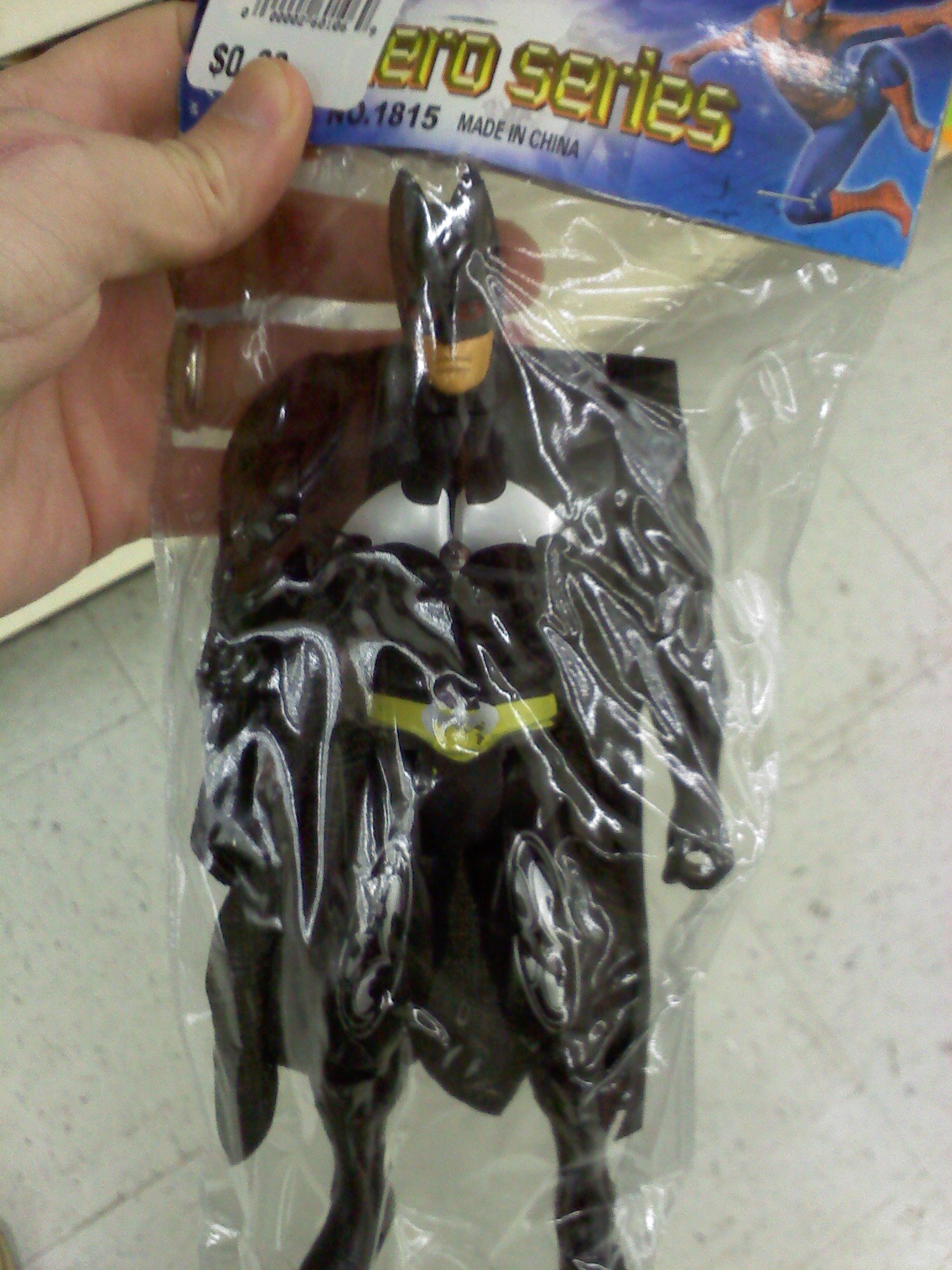After making that Batman of Zur-En-Arrh custom I’ve been going a bit custom-crazy lately, looking for cheap figures I can add to my custom pile, so last weekend the missus and I ran some errands and I had toys on the brain. We went to a Toys “R” Us which yielded nothing unfortunately, but also a Big Lots type store called What A Store. Now that I think about it, it’s more of a dollar store smashed together with a Big Lots. I was hoping to get some super cheap toys, instead they had these 69 cent crappy bootleg “Hero series” toys. Anyone who has seen a crappy bootleg figure has probably seen something very much like this. I’m always surprised with the weird flourishes bootleggers add here and there, like the red eyes on Batman and that crappy jewel thing in their chests. They actually did an okay job nailing Batman’s costume here.