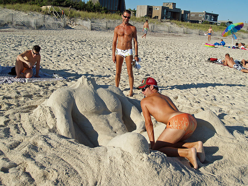 So, I’m watching this movie called The Wackness (review coming soon) and some of the characters head to Fire Island. I’ve heard of this place a bunch, but mostly in a Fountains Of Wayne song, but didn’t know anything about it, which lead me to checking out the Wiki page (which you can read here). Anyway, I was delighted to see the following picture on the site with the caption “Tourists on the ocean-side beach of Fire Island Pines.” As long as I say that the photo was taken by, snicker, David Shankbone, I can post it here. Looks like a fun place!
