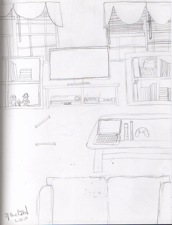 It’s been a while since I’ve drawn anything of substance lately. Not that this is some mind blowing work of art that I’m posting, in fact, you can see most of my erase marks in the scan which is embarrassing. It’s also all on a bit of an angle thanks to my inability to draw a level straight line. Anyway, this is sort of the view from behind my love seat (where I sit almost all day obsessively checking email and blog stats). I changed a few things to make myself look less messy than I actually am, but it’s a pretty faithful representation. Enjoy.