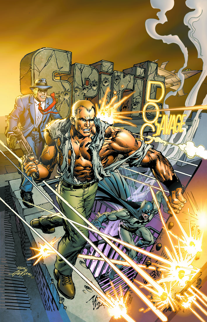 See, the idea is to take badass, powerless characters like Batman, Doc, Black Canary, The Spirit, the Blackhawks, Justice Inc. and Rima The Jungle Girl and tossing them up against some crazy villains while keeping the books and characters securely rooted in the pulp/noir/crime playground. And don’t think of this as your regular Batman, this is some pure Golden Age Batman goodness with him packing heat and firing on anyone who messes with him. If the list of characters above left you scratching your head, check out this link which has scans of character sketches and descriptions from Batman/Doc Savage.