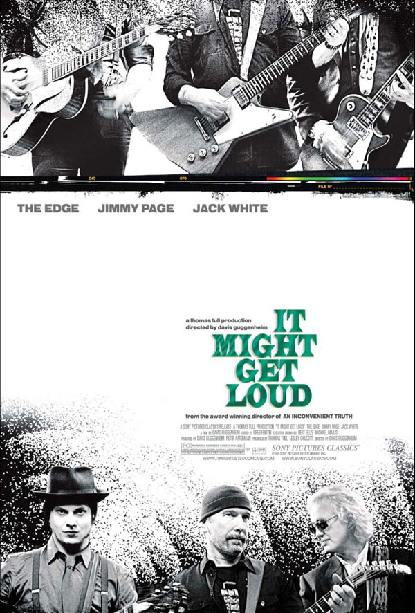 Gah, I should definitely be writing some freelance right now, but I just had to tell you guys about a documentary called It Might Get Loud. I had heard about it on NPR back when I was getting up early and working like a schmuck. Anyway, the documentary has two real purposes. The first is to put Jimmy Page (Led Zeppelin), The Edge (U2) and Jack White (The White Stripes, The Raconteurs and The Dead Weather) in a big room with their guitars and gear and just watch them talk, ask each other questions and, of course, play together. The second purpose is to follow each member around, get their histories and background as well as a look at what they’re doing now.