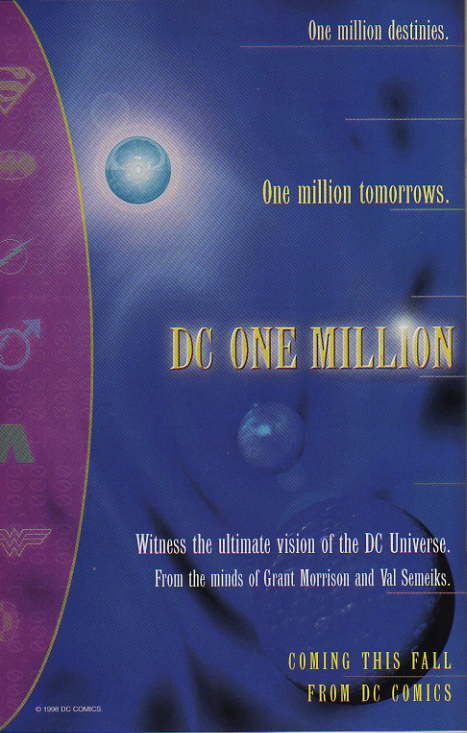 To 15-year-old me, comics didn’t get cooler than DC One Million. Back in 1998, DC kicked off an event that had the heroes of the day interacting with their counterparts in the 853rd Century (because that’s when the millionth issue of a DC comic would conceivably come out if numbering staid consistent and, you know, we don’t blow ourselves up or become enslaved by aliens). Anyway, there was a four issue miniseries and then every book at the time got a tie-in that’s actually numbered as #1,000,000, which I’m sure screwed up a lot of people’s filing systems. Do you put them in at the end of the run (like I did) or keep it in it’s chronological place? Such burning questions!