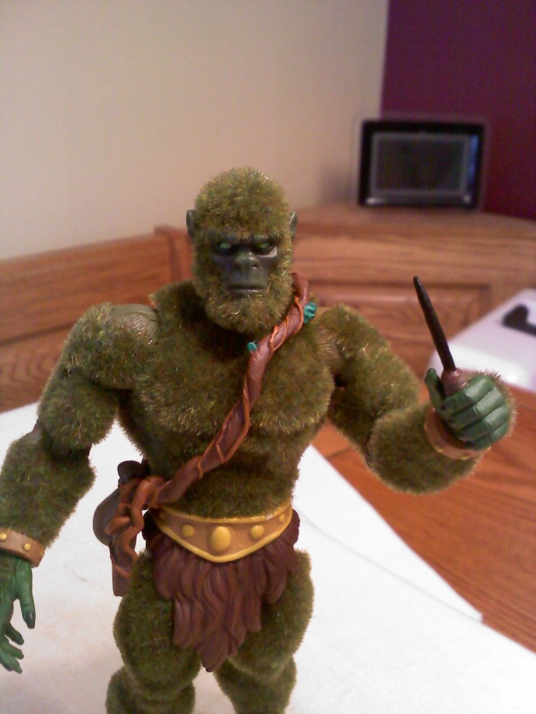 MASTERS OF THE UNIVERSE CLASSICS MOSS MAN! Oh snap. The first thing I noticed when opening up the brown box that the familiar MOTUC white box comes in is the pine smell seeping through the boxes. Man, it’s pretty strong. I don’t remember the toy smelling when I was a kid. I don’t know if it wore off or maybe I got one without it, but he was flocked as a mother trucker. Being one of my favorite original He-Man figures, this is so far my favorite of the group of Masters Classics figures I’ve gotten.