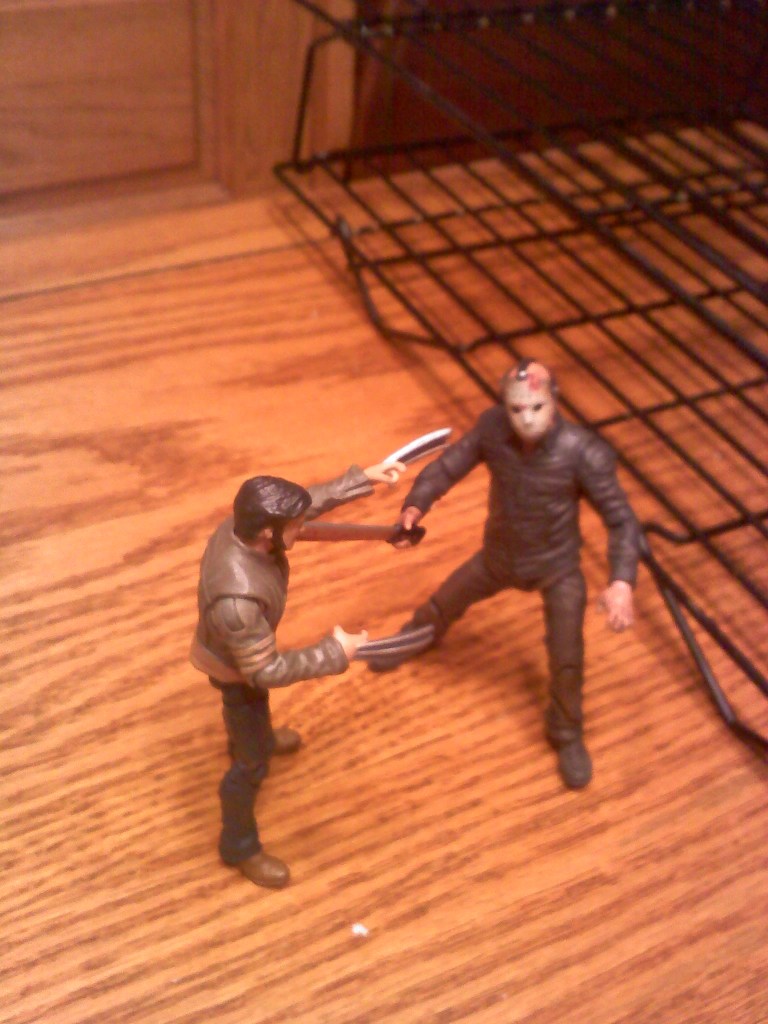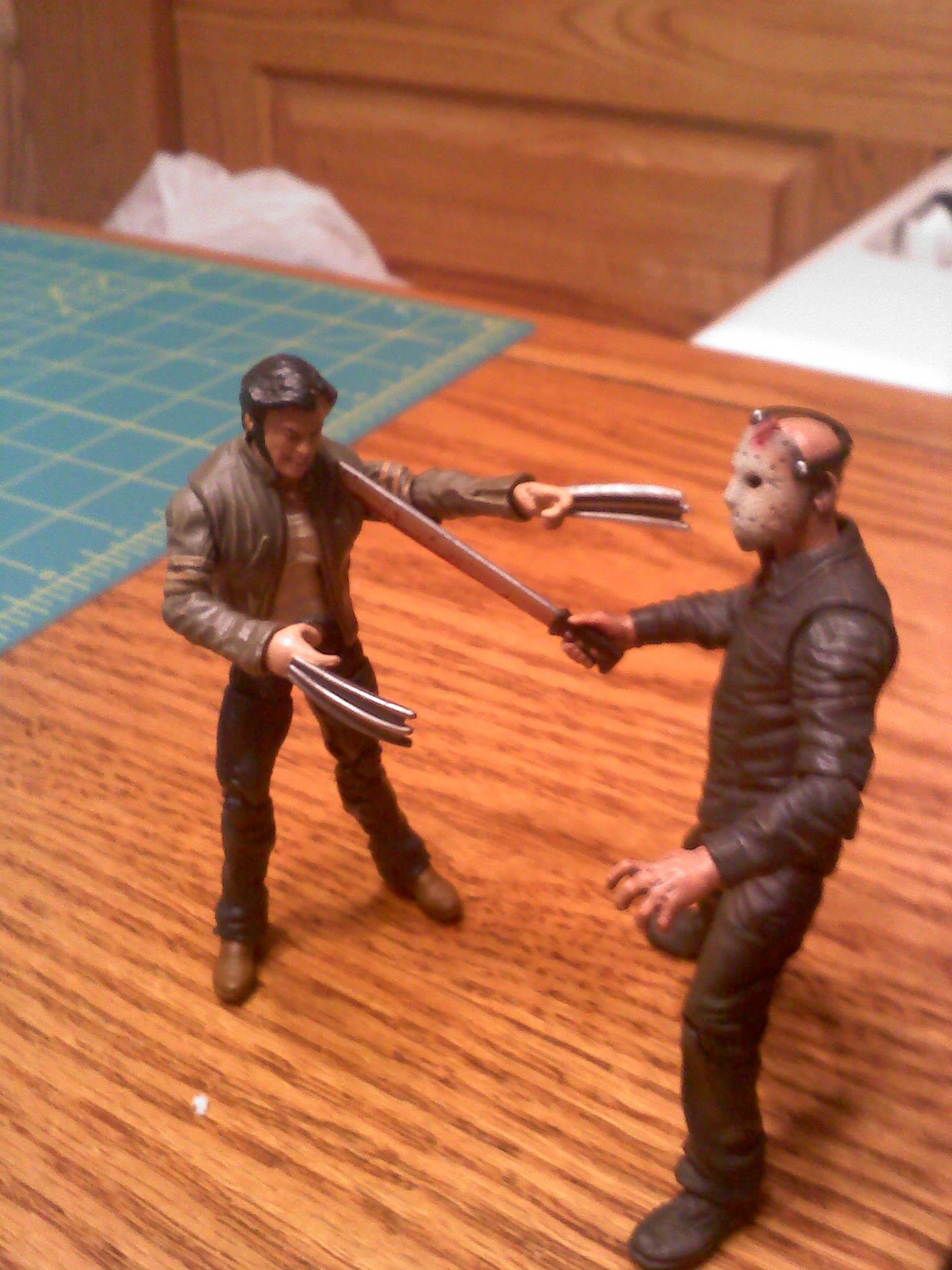 Here you have a 3 3/4-inch Hasbro Wolverine in Jacket from the Wolverine: Origins line and a 3 3/4-inch Jason Voorhees from Mezco’s Cinema Of Fear series facing off on my kitchen tables. On my desk, they went from fighting to riding the bulldog that came with the DCUC Lobo SDCC figure from a few years back. In my imagined crossover, though, they would spend the entire comic or movie just slashing the shit out of each other getting angrier and angrier the entire time. Here’s how I see it going down. Wolverine’s on one of his many cross country trips when he finds himself in Crystal Lake. After a day or so of fishing and hunting, Jason shows up to politely ask Wolverine to leave. The pair throw down, but Wolverine doesn’t know what he’s dealing with, so he assumes Jason dies at the end of the battle and heads back to New York.