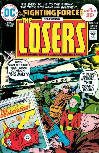 My favorite story is called “Devastator Vs. Big Max” from Our Fighting Forces #153. Consider this SPOILER territory. The idea is that the Nazis have this gigantic canon they call Big Max that can blast towns and convoys from miles away. The Allies don’t have anything to counteract this bad boy, but they’ve got a plan: Devastator. A sci-fi loving soldier tells the Army about his plan for a futuristic tank type vehicle called Devastator that the Losers tell him is real. In reality, it’s a sham set up to scare the Nazis into revealing the location of Big Max so the fliers can blow that shit up. In the end the sci-fi lover is completely disappointed, which is kind of poetic. Most of the stories end like that with no victory ever being 100% for the Losers or their compatriots.
