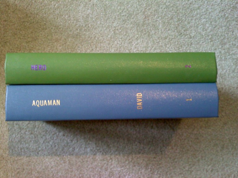 Here’s pics of the spines. I thought the text would have been bigger, but that could be on me and not them. I know you can pay extra to get the actual logo put on the spine, but, again, I’m cheap, so this is the bare bones version. I’m hoping to collect all of Peter David’s Aquaman, hence the 1 on the bottom and his name on the spine.