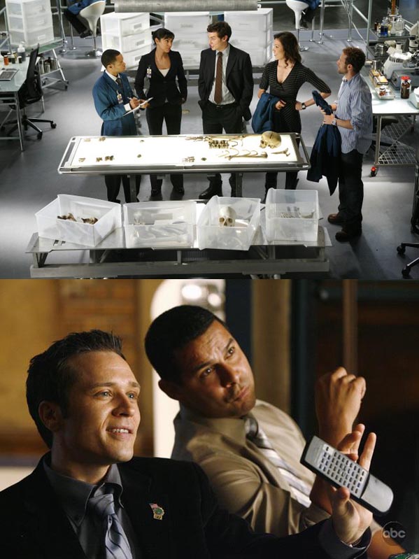BONES: Bones definitely follows a basic pattern. There’s a murder. Lately, we’ve seen either the victim or the person finding the body before the credits. Bones and Booth then show up, examine the crime scene and send everything back to the Jeffersonian lab where everyone pitches in, using science to figure out the crime. Meanwhile, Booth and Bones interview suspects sometimes with the help of Sweets. They usually interview the actual killer, but don’t realize that person is the killer until later when science or intuition tells them who did it.