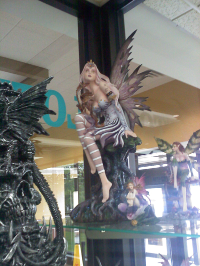 The next day we left for Indiana for my buddy Geof’s marriage to the lovely Eileen with my folks driving (they were also invited, though they probably would have driven us and gone back home if we asked cause they’re awesome). Just outside of Valparaiso we stopped at a rest stopped that a carload of my friends from Toledo also happened to stop at. It was all very serendipitous. Anyway, there was a little gift shop that had a ton of statues like the dragon and fairy here. I contemplated buying one as a wedding present, but the missus reminded me we already had a gift and I’m not that generous.
