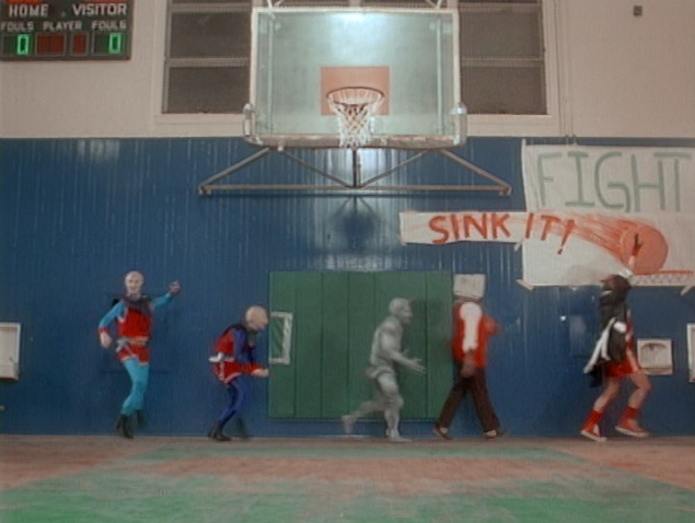 I don’t think it’s a spoiler to say that the film–and the fate of the Earth–comes down to a basketball game between the unbeaten Demons (the high school dribblers) and the monsters, aliens and demons who have been killing kids off left, right and center throughout the movie. From left to right in the picture is Dume and Glume (or maybe I got that backwards, either way, they both sound like He-Man’s annoying magician friend Orko), the horny monster, the computer man and Mr. Armageddon. They’re joined by a student-turned-zombie as equipment manager and a red monster as a fan. And you thought Teen Wolf was ridiculous at the end. Even with all the murder and mayhem throughout the day (some of the red shirt kids who got slaughtered had to have been missed, right?) the gym is filled with people ready to watch the game.