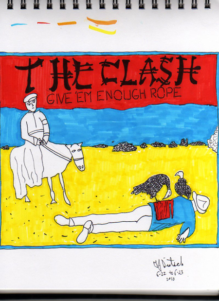 I missed last week because I tried drawing that rad Boston cover with the spaceship (the first one) and it turned into a complete, embarrassing mess. And you’ve seen the low quality of some of my art, so you can imagine how poorly it turned out. This is the first installment of Covering Vinyl where I drew a record I don’t actually own (either on vinyl or disc). The idea to do a Clash record just came to me and I went with Give ‘Em Enough Rope because it wasn’t a picture of actual people.