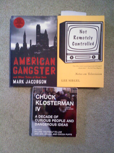 American Gangster by Mark Jacobson contains stories that inspired the movie that I haven’t seen, but I love mob stories, so that should be fun. Not Remotely Controlled by Lee Siegel is a book full of TV criticism and essays, I haven’t heard of the author, but I love TV, so it was an easy buy for a buck. And finally, I’ve heard good things about Chuck Klosterman, so when I saw an audio book version of IV on the cheap, I figured it’d be a good place to start, that won’t interfere with my now-daunting summer reading list.