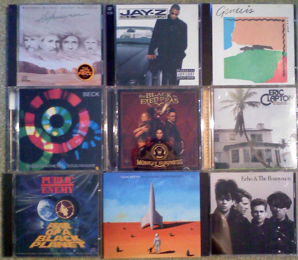 The next day, while the missus and her mom were at the shower, her dad and I went to the flea market, where I found a guy selling CDs for $4 or 10 for $20. It was about the second table I saw and I spent most of my time there. I walked away with Zwan’s only record (not pictured), The Highwaymen’s Highwayman, Jay-Z’s Vol. 2, Genesis’ ABACAB, Beck’s Steropathetic Soul Manure, The Black Eyed Peas’ Monkey Business, Eric Clapton’s 461 Ocean Boulevard, Public Enemy’s Fear Of A Black Planet, Tom Petty’s Highway Companion and Echo & The Bunnymen’s self titled record. This lot is a good combination of getting more albums by bands I like (PE, Jay-Z, Petty), trying new things (Echo, Genesis, solo Clapton), getting some Supergroup Showcase fodder (Highwaymen and Zwan) and also getting the song “My Humps.”
