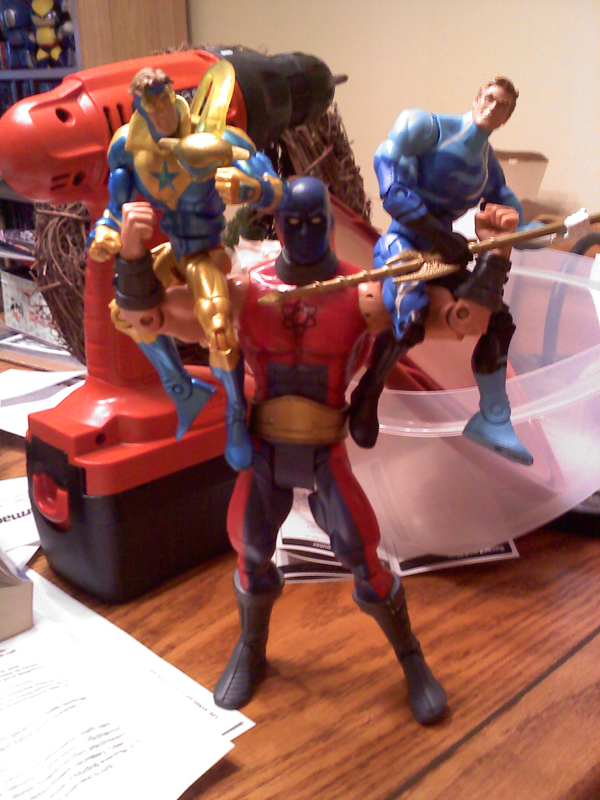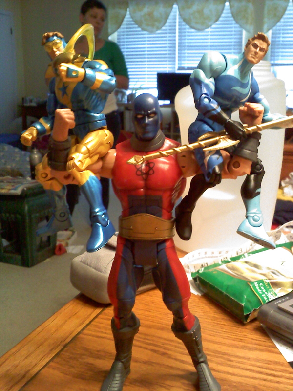 As you can see from the pictures (aside from the missus’ clear contempt for what I was doing in the background) I finally decided on the classic version of the Booster figure even though I really wanted the Skeets with Mr. Mind in it. I decided to go with the larger figure I preferred, which is the one with the collar. Anyway, Aquaman and Booster are both great figures. I like how Skeets attaches in the back in the same way that Mr. Terrific’s T Spheres do. I’m also a big fan of the Atom Smasher figure, though how much cooler would it have been if it was his previous identity Nuklon? As I mentioned his right leg popped out a few times, but overall, he’s a great build-a-figure and definitely the largest figure in my collection (I have the Giganta wave figures, but not Giganta herself or any of the equally large Marvel Legends ones).