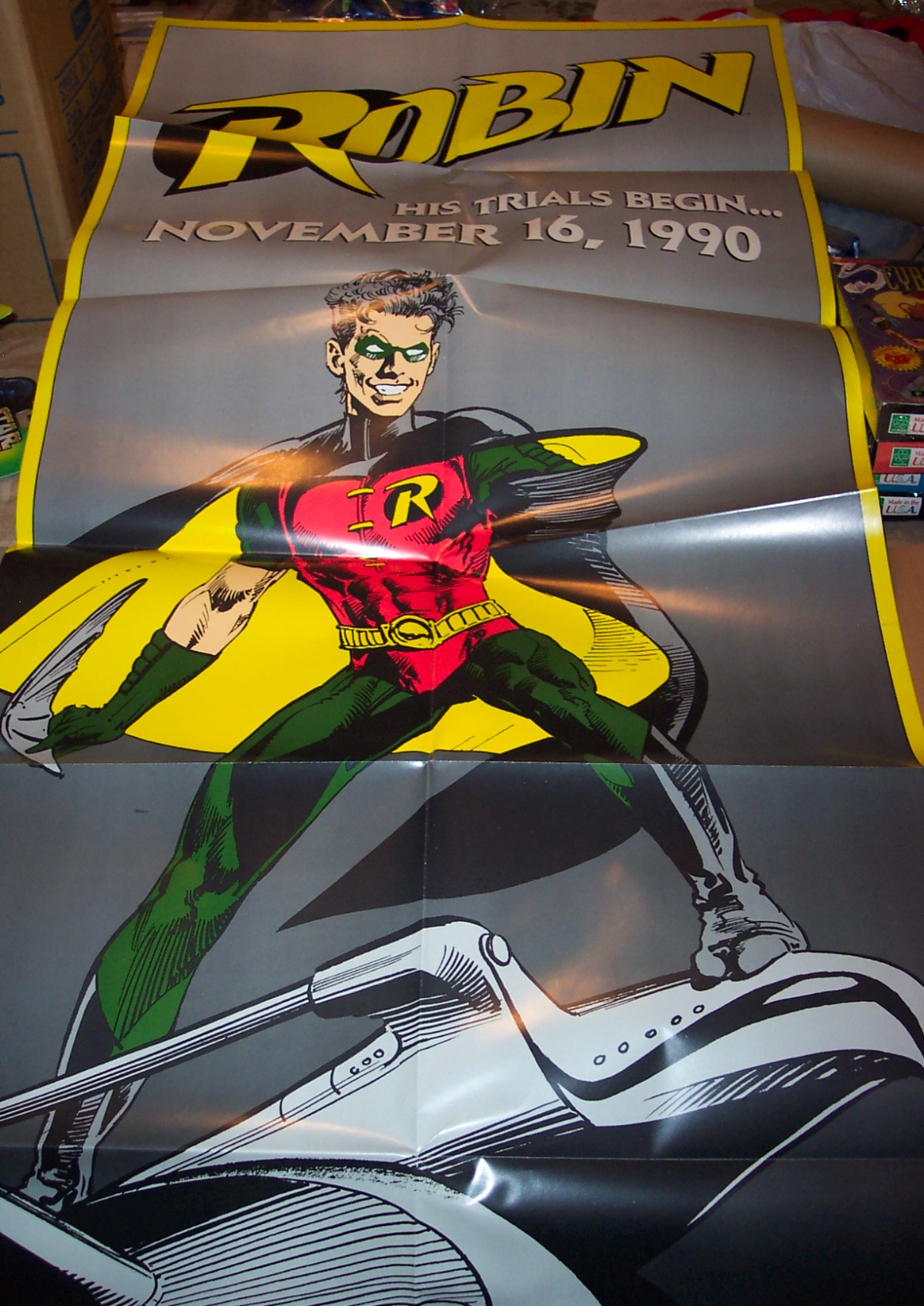 This poster came with a promo pack given to comic shops in the early 90s. It’s clearly not the same coloring as the poster on the wall and it lacks the moon-looking object, but as we’ve seen with the Golden Age and Death of Superman posters, the ones appearing on the show were sometimes changed for whatever reason. I also thought it might have been the Robin from Robin 3000, but the color scheme on the costume is completely wrong. Anyone got any ideas or have this poster?
