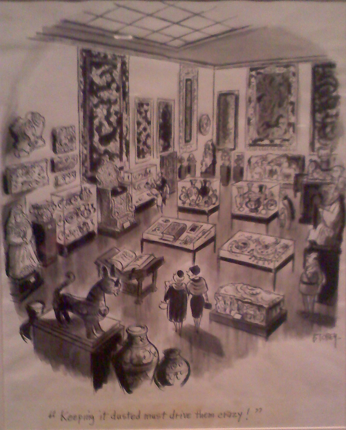 The last picture I snapped, I wasn’t supposed to. It’s a cartoon for The New Yorker by artist Barney Tobey (you can read his 1989 obit here to learn more about the man). I’m not sure if you can read the caption, but one well-dressed woman is saying “Keeping it dusted must drive them crazy!” to another well-dressed woman. It’s kind of meta, but it was fun.