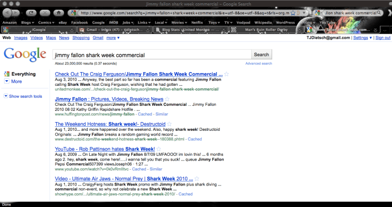 Well, look at that. It seems as though my post about the Craig Ferguson/Jimmy Fallon Shark Week commercial has become something of a big deal as it’s the number one result when you search “Jimmy Fallon shark week commercial.” The number two result? A link from the Huffington Post to UM (scroll down to the bottom and you’ll see it)! I know this is pure ego stroking on my part, but it’s nice to be noticed, especially when you’re not sure if the hits you get are based solely on the fact that you basically write down everything that happens on reality shows which, I just realized recently, makes it great search engine fodder. I really wish WordPress offered bounce rate numbers like Google Analytics does. Anyway, this was a fun surprise today.