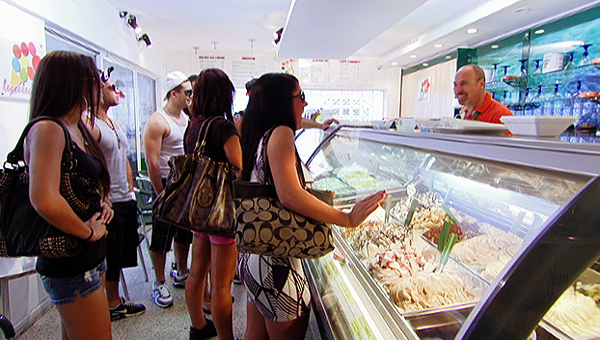 10:40pm – This time around they’re working in a gelato shop. Haha, he says Pauly has to wear a hat. This guy’s gotta be thinking “These douche nozzles better bring in tons of business because they’re looking at me like I’M the asshole.”