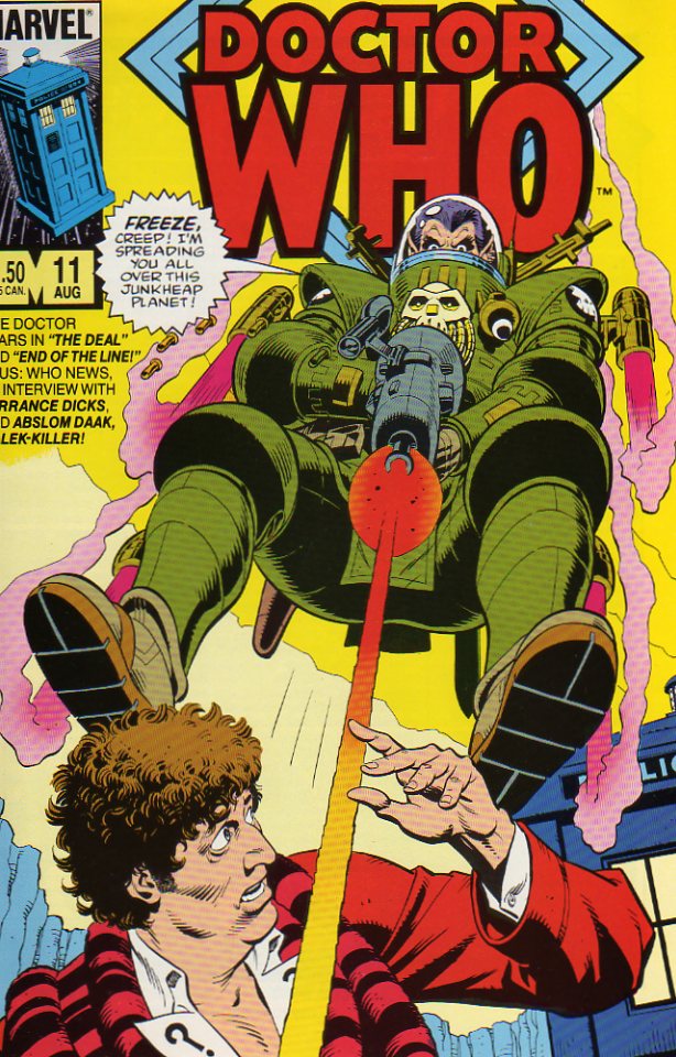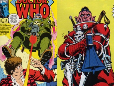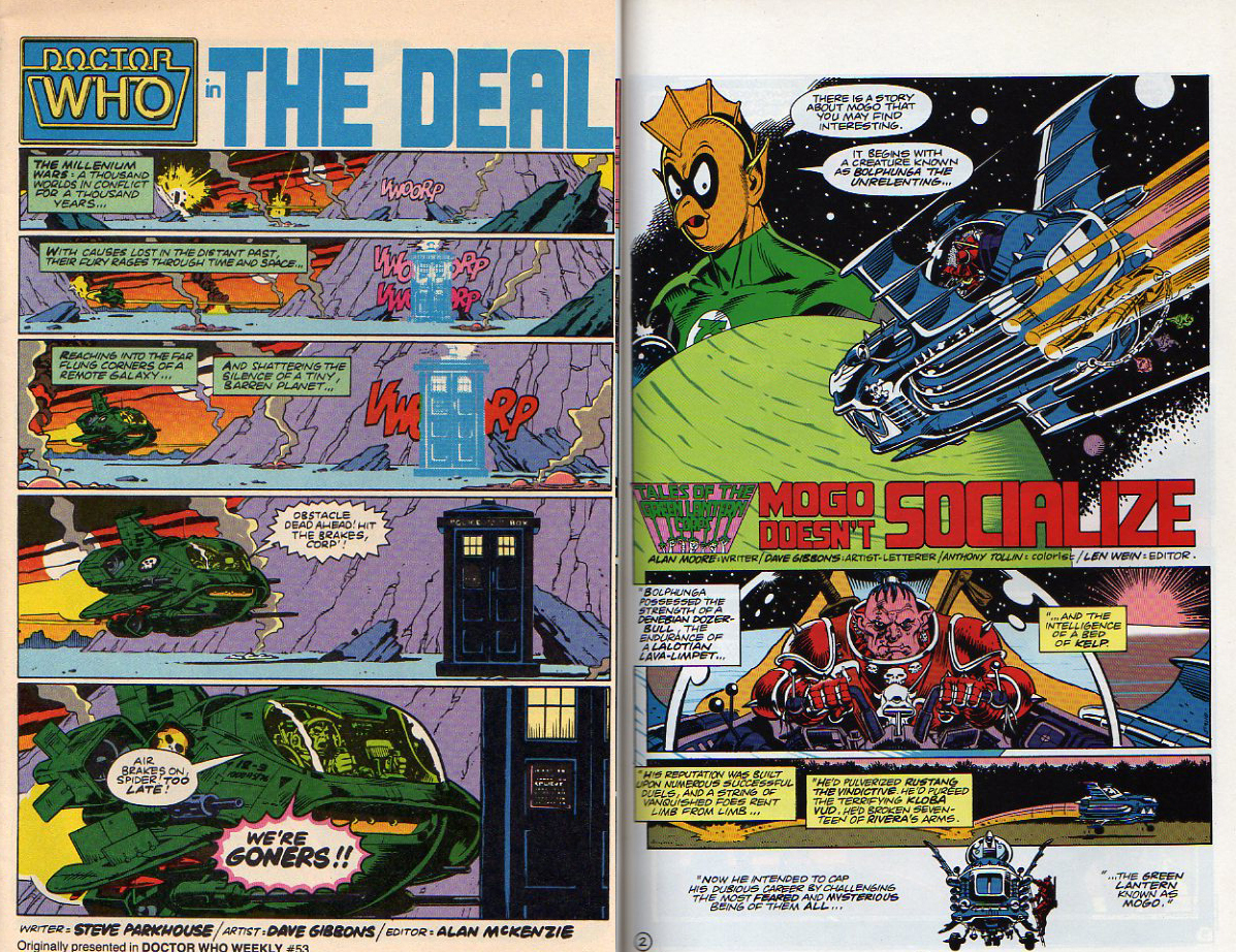 I was thrilled to discover a bunch of Marvel’s Doctor Who comics in The Box last time I went to the storage unit. There are probably 6 or 7 issue in total. It turns out that Dave Gibbons did a lot of the interiors which has been pretty cool to look at. I took most of the pile into another room to read through them and was surprised to see the cover to #11 lying on the floor next to my spot on the couch when I went back into the living room. “Hey, that guy looks familiar” I said to myself and then went for my treasured copy of DC Universe: The Stories Of Alan Moore and sure enough, this Doctor Who character–referred to only as Corp and Corporal–looks an awful lot like Bolphunga from Moore and Gibbons’ Green Lantern #188 back up classic “Mogo Doesn’t Socialize.”