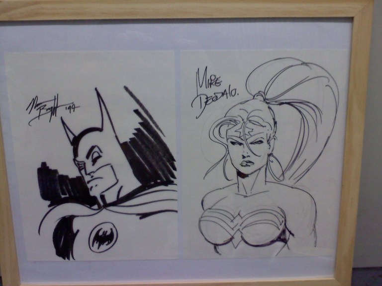 On the left you have the very first sketch I ever got. In 1994 I had only been collecting comics for a couple years. I was 11 and I was completely blown away that an honest to God comic book artist was going to be signing and sketching at JC’s Comic Stop in Toledo, Ohio! To be honest, though, I didn’t know who Norm Breyfogle was, but I picked up a few issues of Prime and found a Batman or Detective Comics issue and got those signed too. I remember standing in line with my dad. I’m sure he wasn’t super pleased because nothing at JC’s ever happened on time. I saw the guy in front of me getting a sketch of Batman and I don’t remember if I asked for one when it was my turn or if my dad did, but I was amazed at how quickly he composed this Batman. We’re talking a minute. It was amazing.