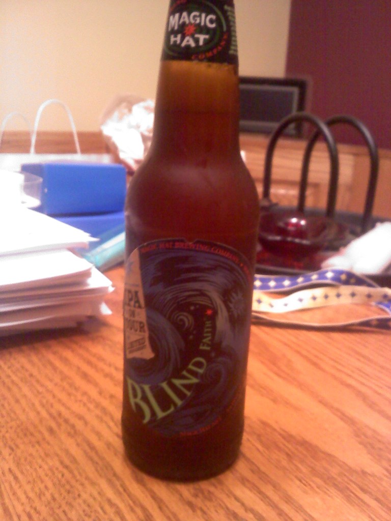 Finally, I’m finishing up with the IPA on Tour entry Blind Faith. I used to really dislike IPAs for their intensely bitter taste, but much like the general taste of beer grew on me after moving out to New York where liquor is far too expensive for a lowly intern or research assistant, I’m really starting to enjoy them. I discovered that earlier this summer when I tasted Sam Adams’ Latitude 48 (which came in a pack I should definitely review) and found myself enjoying it. There’s something about the bitter bite that I’m growing to enjoy and that’s what I liked about Blind Faith. It has a hell of a bite because it’s an IPA, but doesn’t taste as caustic as some of its ilk do. There’s something about the bitter finish that makes me want to take another sip. I also like how it lingers on my tongue.