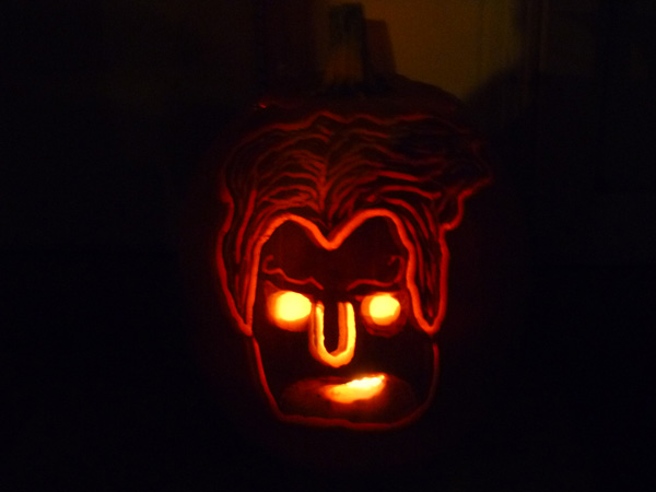 The missus and I traded off on handing out candy, it went pretty well for the most part. We only had a handful of douchey older kids who didn’t wear costumes. I gave them Chiclets. Finally, here’s my Lion-O pumpkin all lit up, you can see it in the daylight here.
