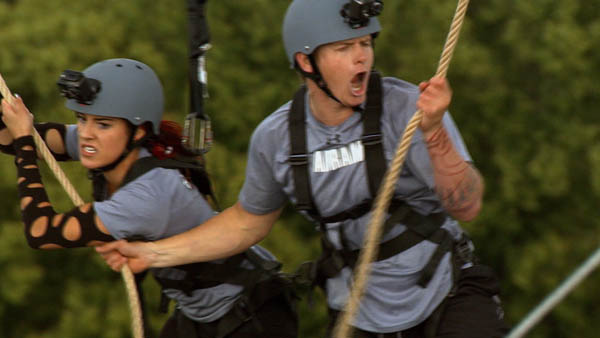 Gray didn’t do a whole lot better and looked a lot sloppier doing it. Abe and CM went across with Abe trying to muscle his way through the challenge. Luckily for him, CM calmed down (she also hates heights) and basically acted as an anchor who literally kept Abe from falling off the rope. Of course, Laurel and some of the others were complaining that Abe did all the work and dragged her across. I think that was just cattiness because CM did a good job. Laurel and Sarah went next and this time Sarah basically dragged Laurel across, but they seemed to keep each other calm. Then it came down to Dan and Luke. As someone pointed out on the show, this wasn’t a great match-up because Dan hates height (what’s with these people?) and Luke doesn’t have much reach. They got about halfway through the course, then Dan seemed to stop moving which prevented Luke from grabbing the next rope. Dan kind of spaced out and dragged Luke right off the ropes and they just hung there awkwardly.