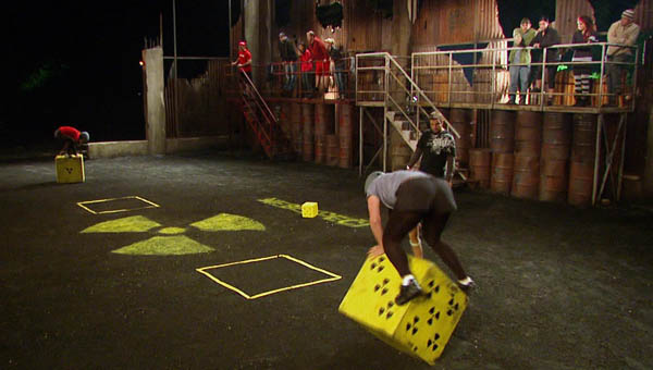 The Gulag was Die Hard, which didn’t seem very exciting at first because we’ve seen it before, but turned out to be kind of a nail-biter. Plus, the thing about Die Hard (which has the contestants on top of giant dice that they have to, for lack of a better word, roll the giant cube into a box and get the correct number facing upwards. The fellas went up first, with Dunbar getting off to a much better start than Dan. It gets a little closer towards the end, but Dunbar kind of handily defeats Dan. I liked Dan a lot so it was a bummer to see him leave. The ladies’ race was actually much closer with it literally coming down to the final roll of the dice and Laurel just barely sneaking away with the victory and going back to her team all pissed off.