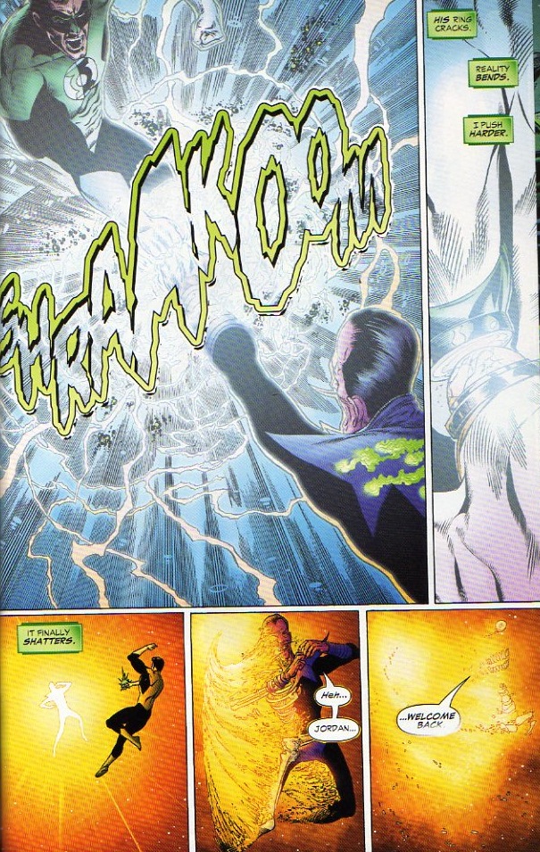I started reading Green Lantern when Hal went crazy. I found out later that a lot of people hated that story, but it made a lot of sense to me at the time, plus I thought this younger Green Lantern was pretty damn interesting. So, I read Kyle’s entire run in the book which lead up to Rebirth. I was split when I heard the news about Hal coming back because, frankly, I didn’t care about him as a character and I thought it was cool that one of the JLA/Silver Age biggies had stayed dead for a while. On the other hand, I REALLY liked the idea of the Corps and felt like I had really missed out on some cool potential stories not having it around. I was in college when the miniseries first started coming out, so I only read it in chunks every few months when I’d get home to my pull list, so some of the details were fuzzy, but there were some very specific parts that had lodged themselves into my memory (specifically the way Johns described each GL using their power ring and Ollie using Hal’s ring).