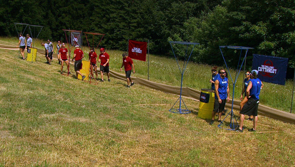 Oh, real quick, the night before the challenge, Derrick had a dream that Tyler sent him home in the Gulag. That will be interesting later on, though not for the obvious reason. The challenge was called High Ball and it’s somewhat hard to describe. Luckily there’s pictures. See, two people have to hold that metal contraption which is, as TJ Lavin mentioned, shaped kind of like a martini glass, while a third has to throw a ball on the flat top part. Once the ball is on the top part, the two players have to walk the contraption up the hill without dropping the ball and then sink the ball in a large basket. Before the challenge began, both Laurel and Sarah talked about throwing it. Abe didn’t say anything about being on to them, but he immediately paired himself with Laurel as carriers. So, after all that big talk about throwing the challenge, once she’s in the moment, Laurel says she’s too much of a competitor, can’t throw it and wants to win.