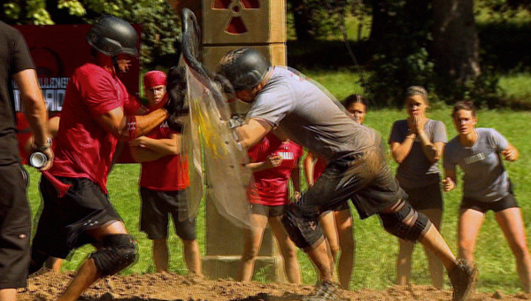 All of which brings us to the actual challenge which is called Riot Act. You’ve basically got contestants wielding riot shields trying to knock opposite team members off of a raised square of dirt into a mud moat with women going against woman and men against men. Whichever team has the last remaining player on the dirt wins. If one team wins the men and another wins for the women, the two strongest people from each of the winning teams is chosen and have to go one on one to see who takes home the victory. The women are up first and it wasn’t particularly exciting. As it turned out this was the perfect challenge for Blue and Gray to work together against Red and that’s exactly what happened. Jenn and Emily from Blue and Laurel and Sarah from Gray immediately targeted Paula and Tori which resulted in Tori getting a bloody nose and FREAKING OUT (as did Brad, but I can relate, I’d be freaked out if something like that happened to the missus on our next reality show competition). Anyway, that just left Paula from Red and these geniuses decided the best way to get her was to attack from all sides which essentially squishes her, but doesn’t get her anywhere closer to the edge. Finally she gets knocked off leaving just Blue and Gray which immediately reveals that Laurel isn’t trying because she’s literally just standing there and watching. Abe starts yelling from the side that if she doesn’t start performing, she’s going in. I can’t quite see what Sarah’s doing at this moment, but she soon gets knocked off which leaves enemies Cara Maria and Laurel against Emily who’s actually a threat and free ride-enjoying Jenn. The missus said she could see Laurel’s insanely competitive nature warring with her insane hatred of CM and Abe. Competition won out and soon, CM and Laurel knocked first Emily and finally Jenn off the mound. The odd thing is that this breaking of the pitiful alliance is never mentioned again on the episode by Blue.