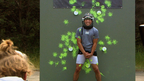 The finale starts with your basic footrace. At first everyone seems to be going about the same pace. Red gets a bit of a lead, but they have to slow down because Tori can’t handle it. This allows for Blue to move ahead. Gray seems okay with staying in the back of the pack for the time being. Blue gets to the first mini-challenge first. It’s called Seeing Spots and the idea is that one person stands in front of a wall with five circles around the outline of their body and the other person has to shoot paintballs to hit those targets. The other two teams catch up pretty quickly, but no one seems to have great aim and Red actually comes out of it first followed by Blue and finally Gray.