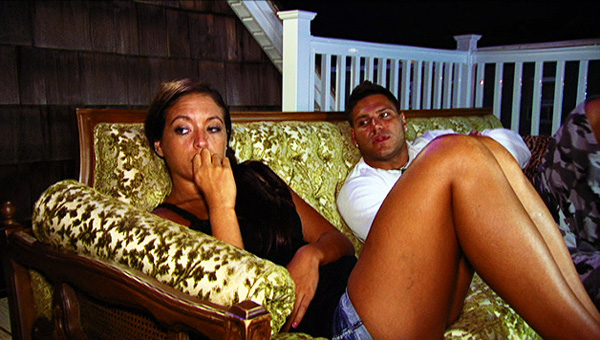 The next morning Ronnie and Sammi get up and go to church. He’s wearing a blinged out shirt and she’s in a tank top and exercise pants. While I’m sure that’s perfectly acceptable on the Shore (I think I should get credit for not going for a Jersey joke here) I guess I’m old fashioned because I think you should make yourself look nice when going to church, not like you’re going to the club or the gym. But hey, that’s just me. As the other roommates wake up, they’re none too pleased because the dud duo took one of the two cars without saying anything to anyone. They all pile into one car and go tanning. When they get back they start cooking the Sunday Dinner, wondering if Ron and Sam will be back for the meal. One of them points out that no one’s ever missed Sunday Dinner before and Pauly said that it’s when people come to squash things and them not showing up makes it seem like they don’t care. In fact, once they return, Sammi said she could care less about family dinner which did not sit well with Vinny or Pauly. I’ve always laughed at the idea that these goobers consider themselves family, but it’s clearly wearing thin with some of them. Earlier in the episode Ronnie told Mike he’d had enough with “the family shit.”