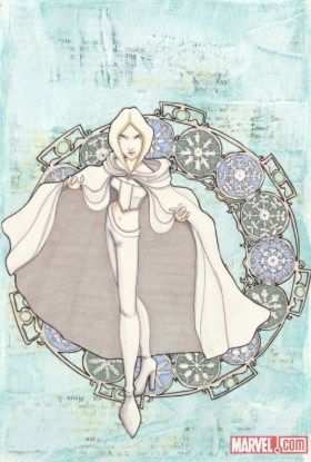 Janet Lee of the amazing Return Of The Dapper Men (which was written by my boy Jim McCann) drew a cover for Uncanny X-Men #534. I wonder what text she painted the background over. (via CBR)